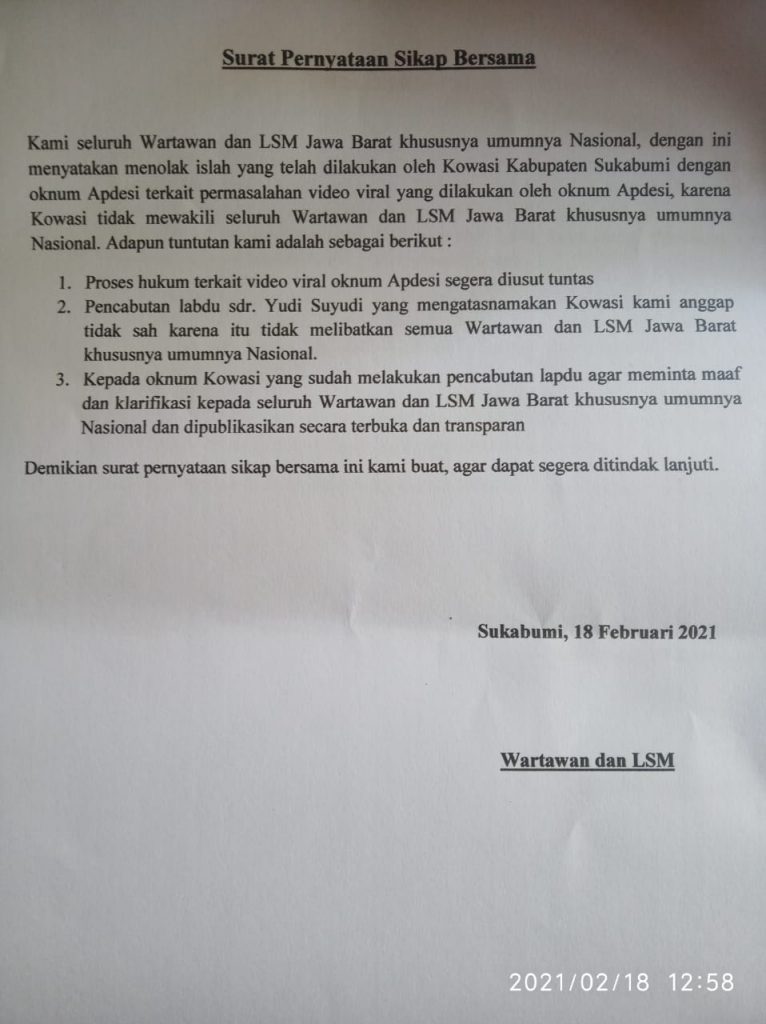 3. Kepada oknum Kowasi yang sudah melakukan pencabutan lapdu agar meminta maaf dan klarifikasi kepada Wartawan dan LSM , Jawa Barat khususnya umumnya Nasional dan di publikasikan secara terbuka dan transparan.